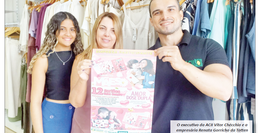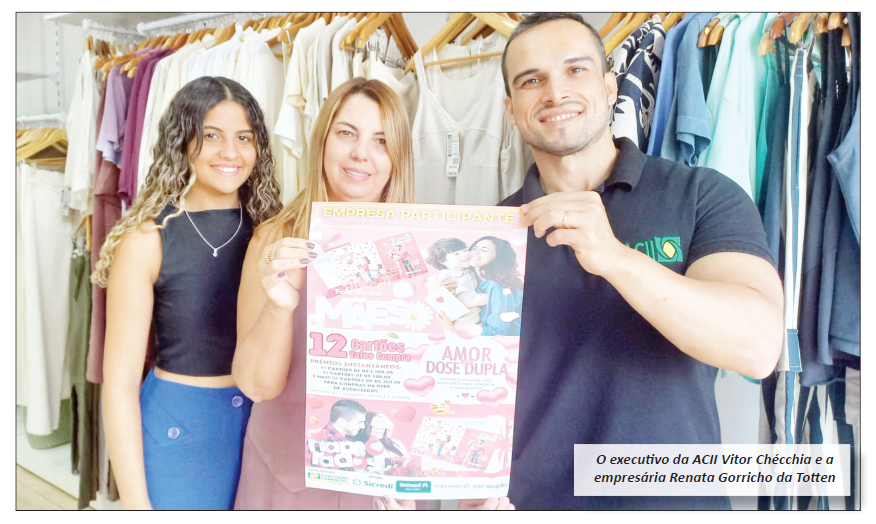 “Participar da campanha da Associação Comercial neste mês de maio tem sido fundamental para o nosso negócio. Como empresária do setor de moda, sei o quanto as datas comemorativas como o Dia das Mães e o Dia dos Namorados são importantes para o comércio local”, afirma Renata.