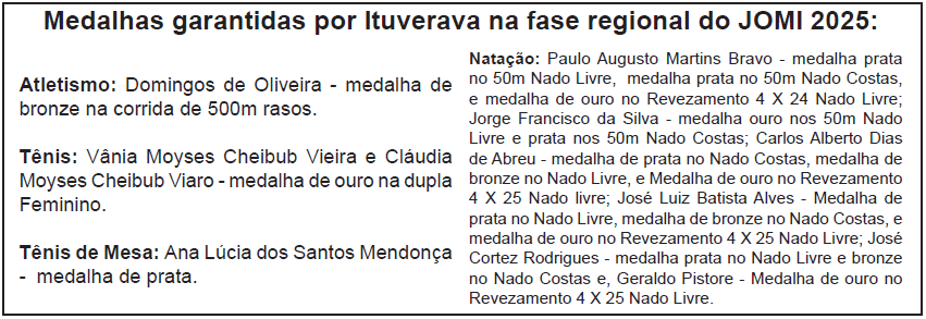 A comitiva de Ituverava, composta por 107 atletas, participou de 14 modalidades esportivas, conquistando classificação para a fase estadual em 04 modalidades, além de diversas medalhas de ouro, prata e bronze (confira no final da matéria).