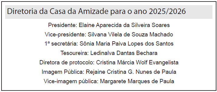 Casa da Amizade: “Aqui não há tarefas grandes para pessoas excepcionais: toda tarefa por pequena que seja, tem sua grandeza pelo toque do amor com que a executa. Aqui prevalece a primeira pessoa do plural: “Nós” Durante este ano “Estaremos Unidas para Fazer o bem!”.