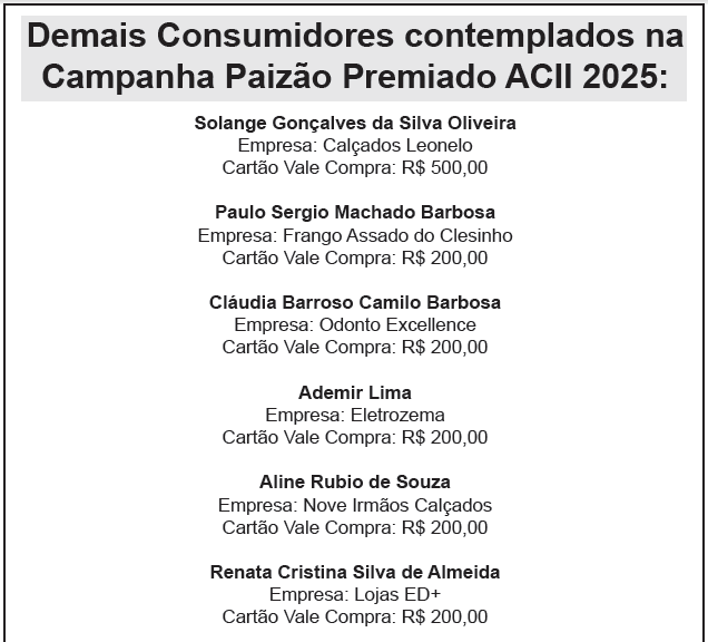 A campanha “Paizão Premiado ACII 2025” realizada pela ACII (Associação Comercial e Industrial de Ituverava), com o apoio da Sicredi Aliança Paraná São Paulo, Unimed Norte Paulista, Sincovami (Sindicato do Comércio Varejista do Municípiode Ituverava, e EC Soluções entregou nesta semana mais um Cartão Vale Compra de R$ 500,00.