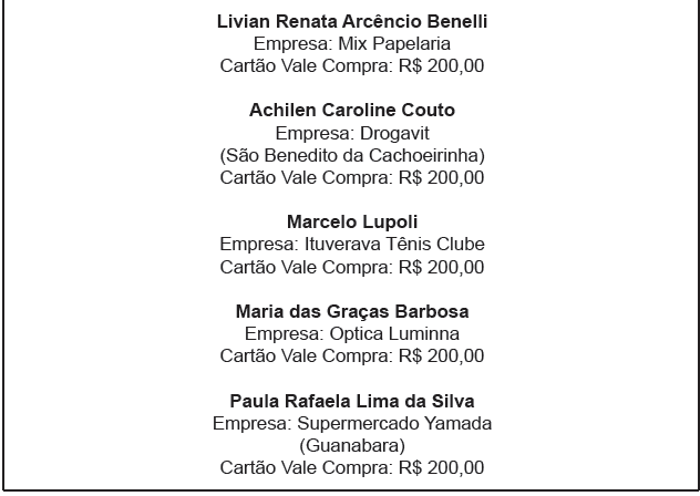 Até o fechamento desta edição já foram contemplados 12 ganhadores dos 13 Cartões Vales Compras da campanha que vai até hoje, sábado, dia 30 de agosto.
