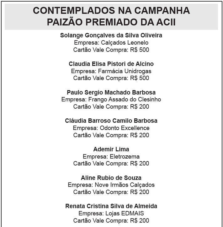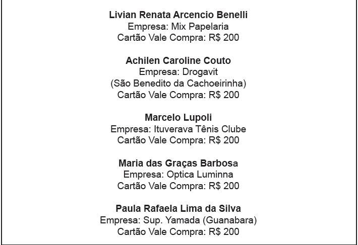 Nesta edição foram contemplados treze consumidores, que ganharam os seus cartões vales compras e já estão realizando compras no comércio. Essa modalidade de premiação permite que o dinheiro fique no comércio local, e estimula o ganhador a comprar e até conhecer outras empresas, para o empresário é uma oportunidade de fidelizar novos clientes.