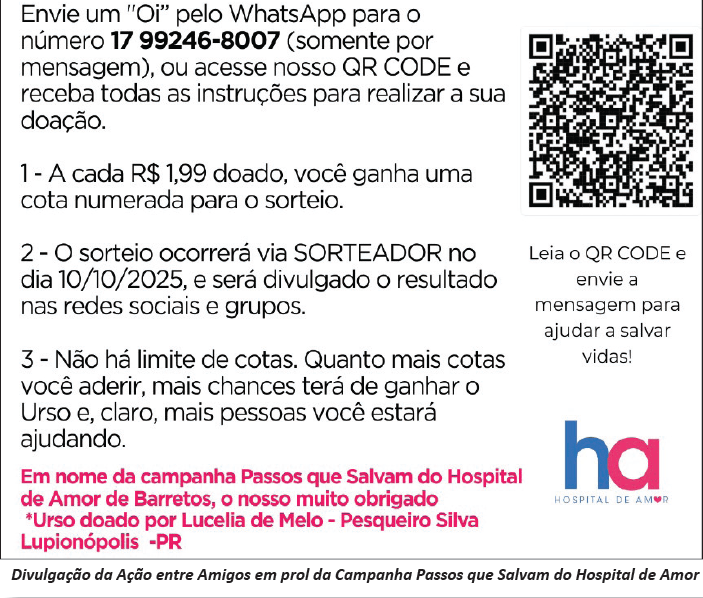 Para participar, as pessoas devem enviar um “oi” para o número (17) 9 9246-8007 ou acessar o Qrcode (ao lado) e receber as instruções para realizar sua doação. Cada R$ 1,99 doado, o doador ganha uma cota para participar do sorteio um urso de pelúcia medindo 1,80 metro de altura.