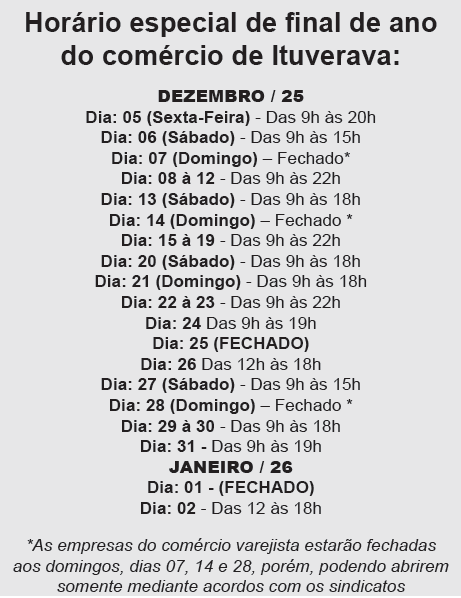 “Quero agradecer aos apoiadores que ao longo do ano fazem parte desse projeto que é fomentar a nossa cidade economicamente”, reconhece. Para atender melhor, os clientes, o comércio de Ituverava iniciou o horário especial de final de ano. Confira no quadro abaixo.