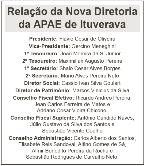 Foi empossada e assumiu no início de janeiro a nova diretoria da APAE (Associação de Pais e Amigos dos Excepcionais) de Ituverava, tendo como presidente Flávio Cesar de Oliveira.