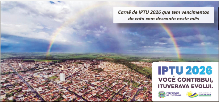 A Prefeitura de Ituverava informa que os prazos para pagamento da 1ª parcela ou da parcela única do IPTU 2026, com 20% de desconto, se encerram nos dias 23, 24 e 25 de fevereiro, conforme a data de vencimento indicada em cada carnê.