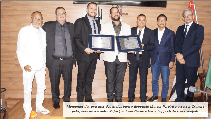Os títulos outorgados para o deputado Marcos Pereira tiveram autorias do presidente Rafael Gabiru e Cássio Dom e para o assessor Granero foram apresentados pelos vereadores Cássio Dom e Neizinho de São Benedito.